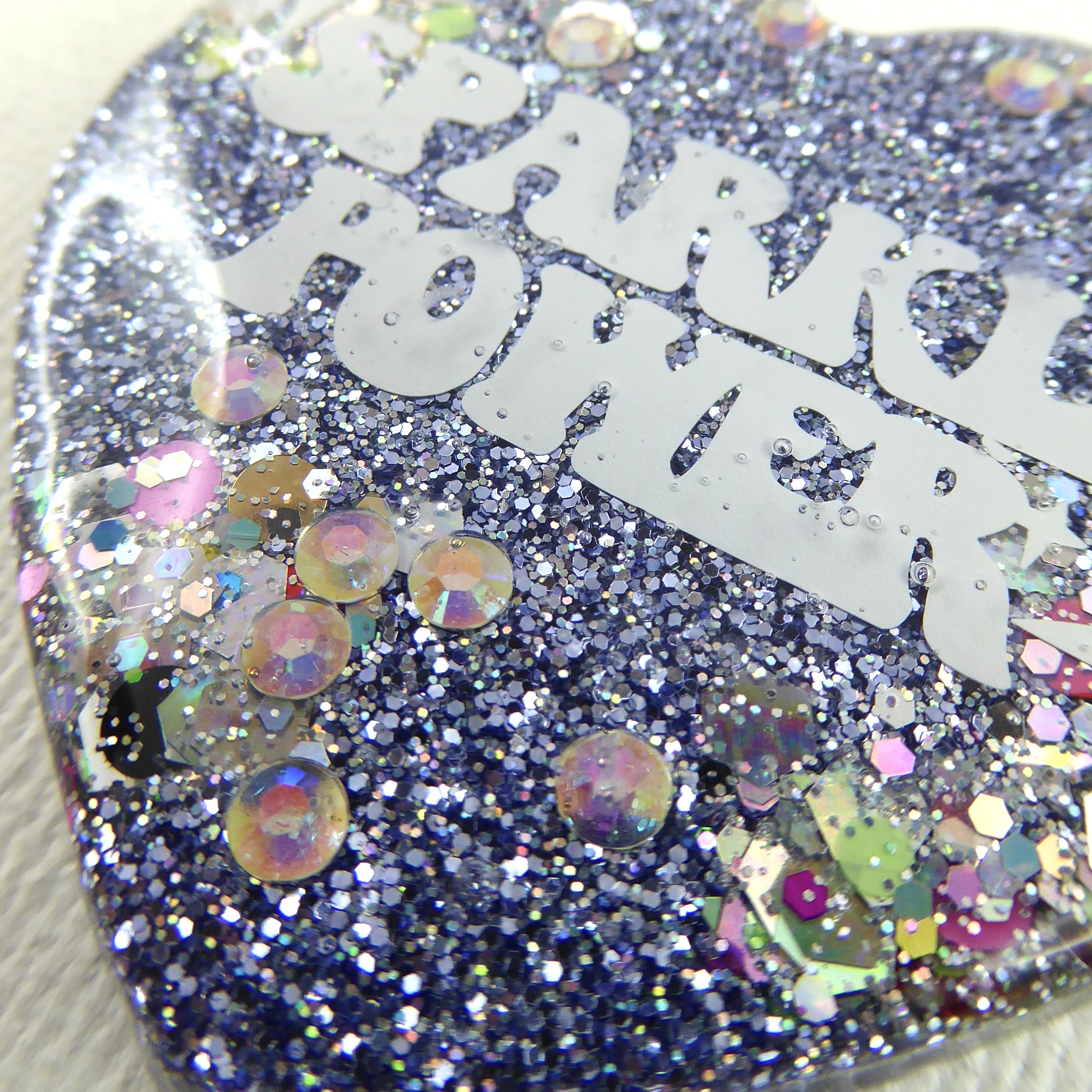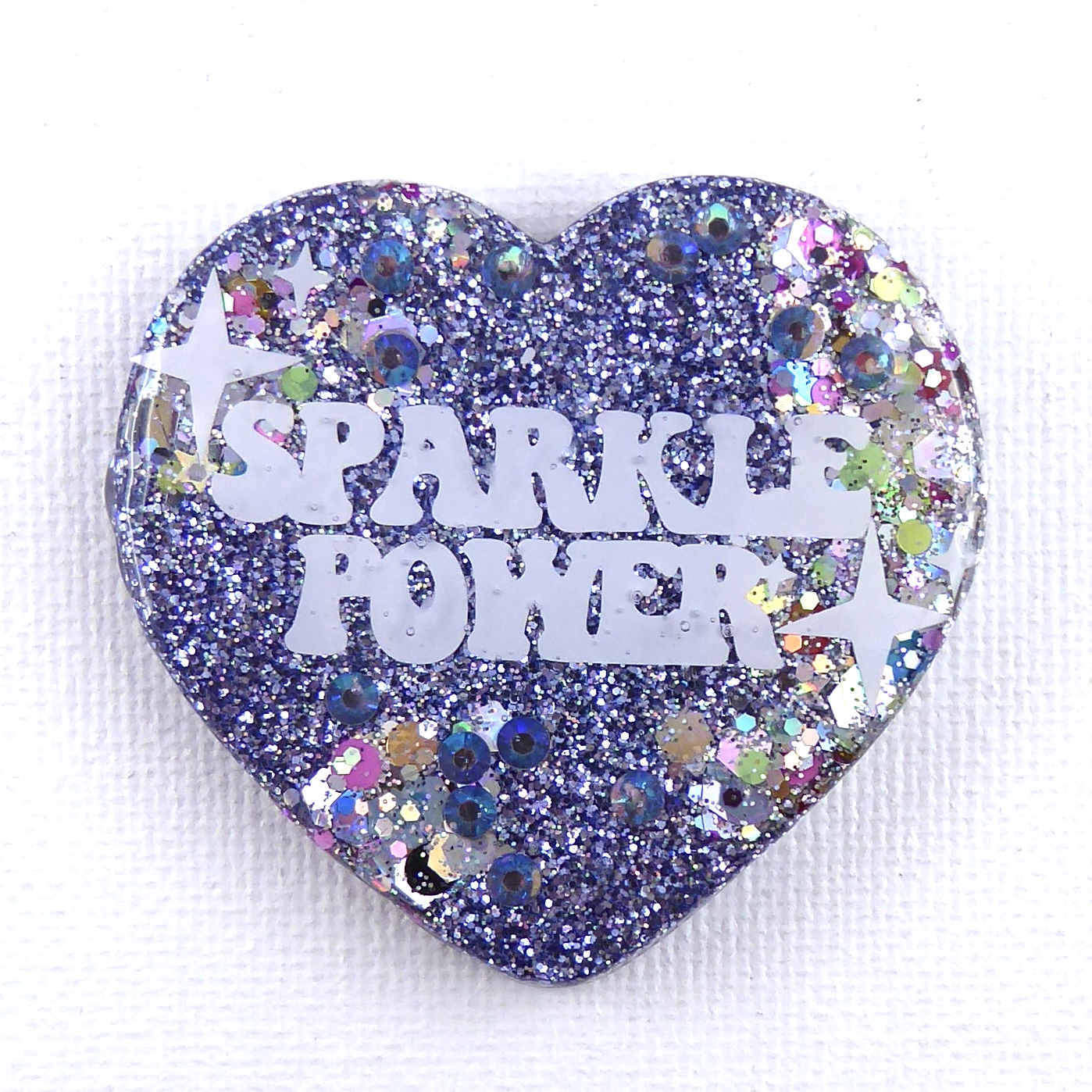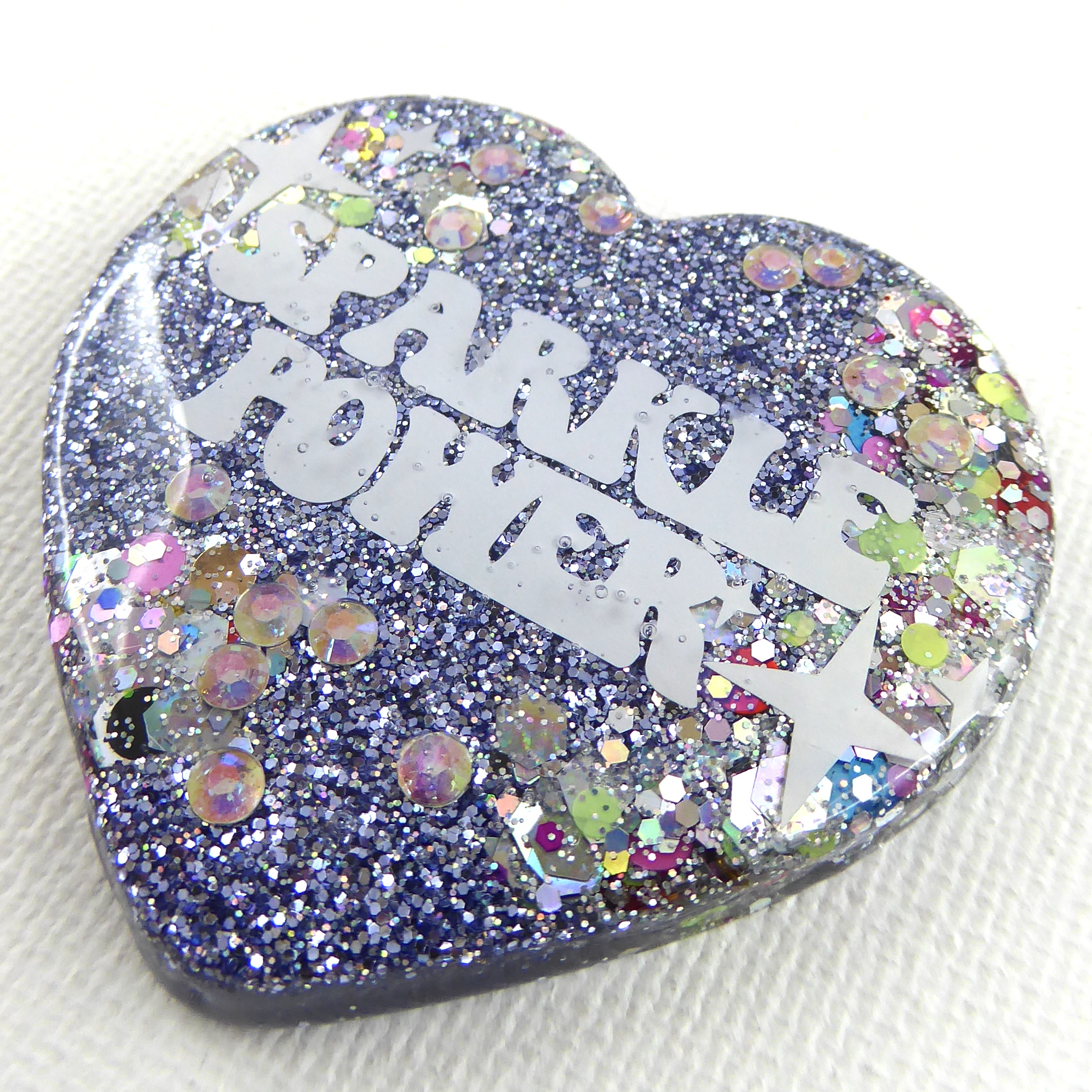 Une broche cœur brillante avec un message qui rappelle l’essentiel : Sparkle Power